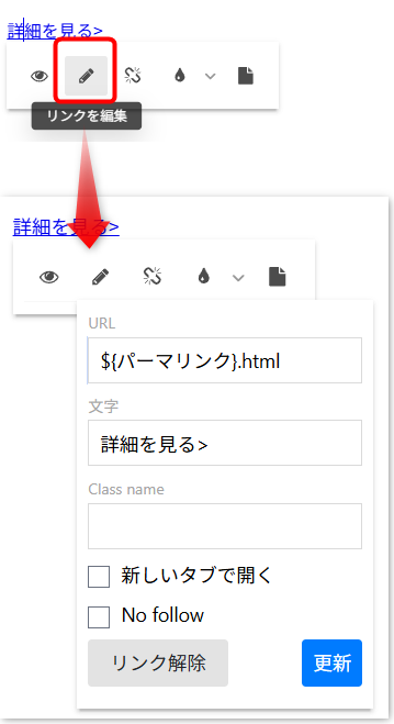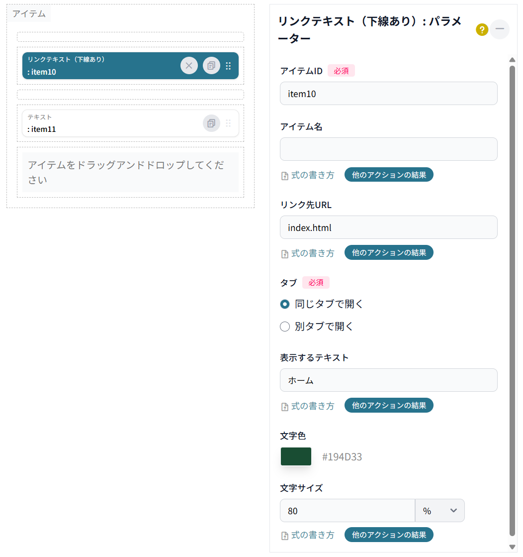 「リンク先URL」には、後述の「ページ生成時処理」のアクション4の結果を使用するため、