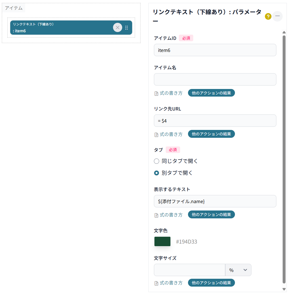 ⇒このアクションの結果を、リンクテキスト(下線あり)の「リンク先URL」に指定すると、添付ファイルをダウンロード可能なリンクが作成できます