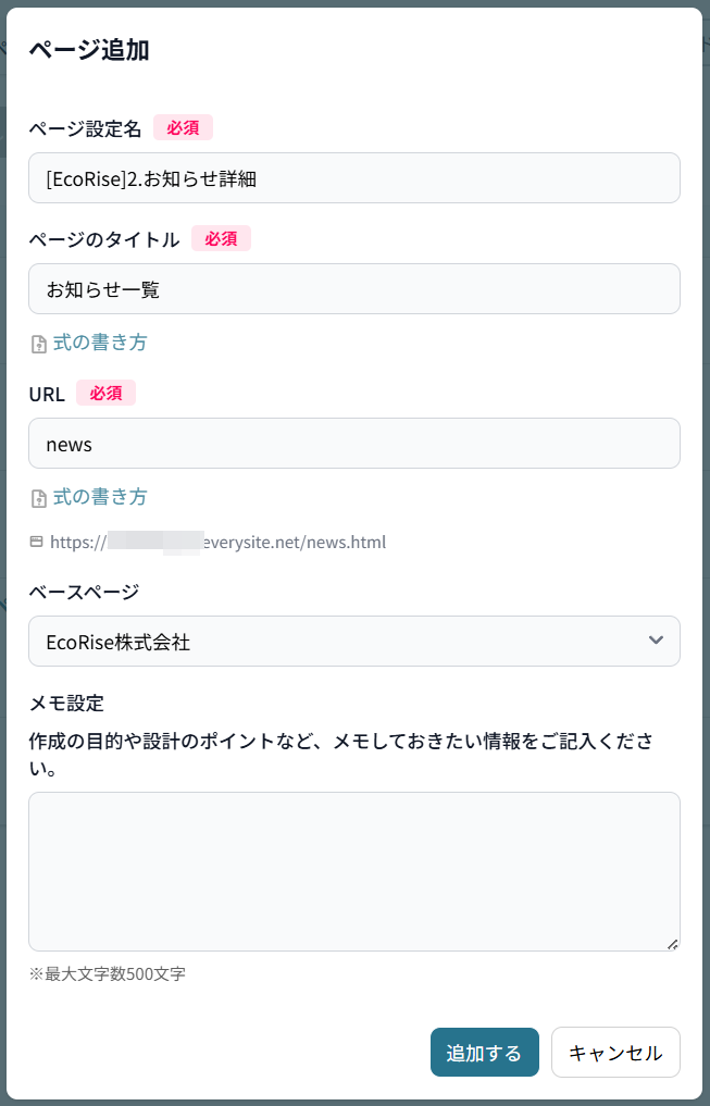 ページを作成する際に、「ベースページ」で上記で作成したページを選択しておきます。
