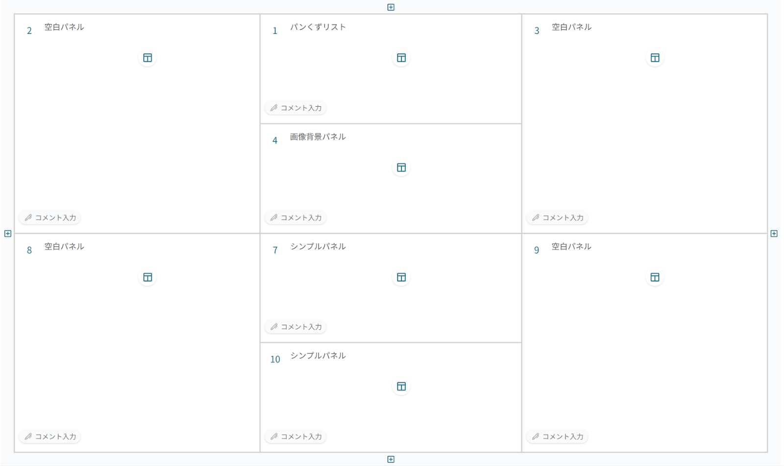 お知らせ一覧と同様に、「空白パネル」はタイルの両端に余白を作成するために配置しているため、このページで主要なタイルのウィジェットは1の「パンくずリスト」と4の「画像背景パネル」、7と10の「シンプルパネル」です。