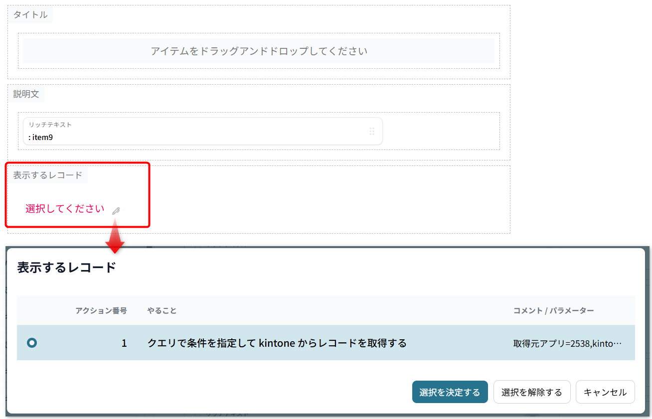 次に、「表示するレコード」で表示するための、kintone のレコードを取得する処理を作成します。