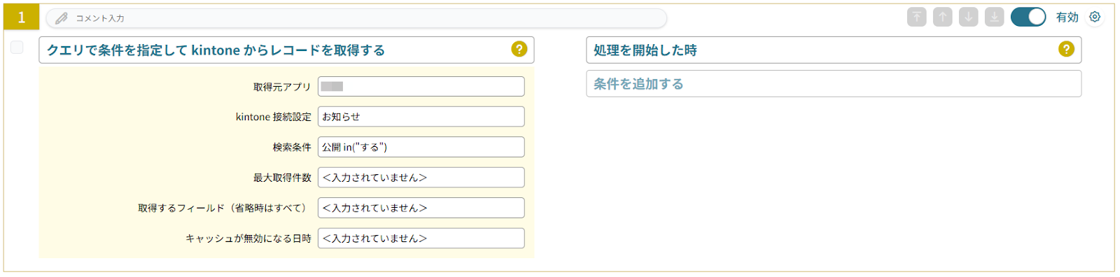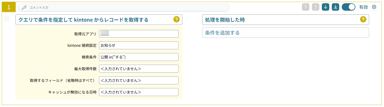 「クエリで条件を指定して kintone からレコードを取得する」を使用し、kintone から「公開」フィールドの値が”する”のレコードを、日付の新しい順に並べて取得します。