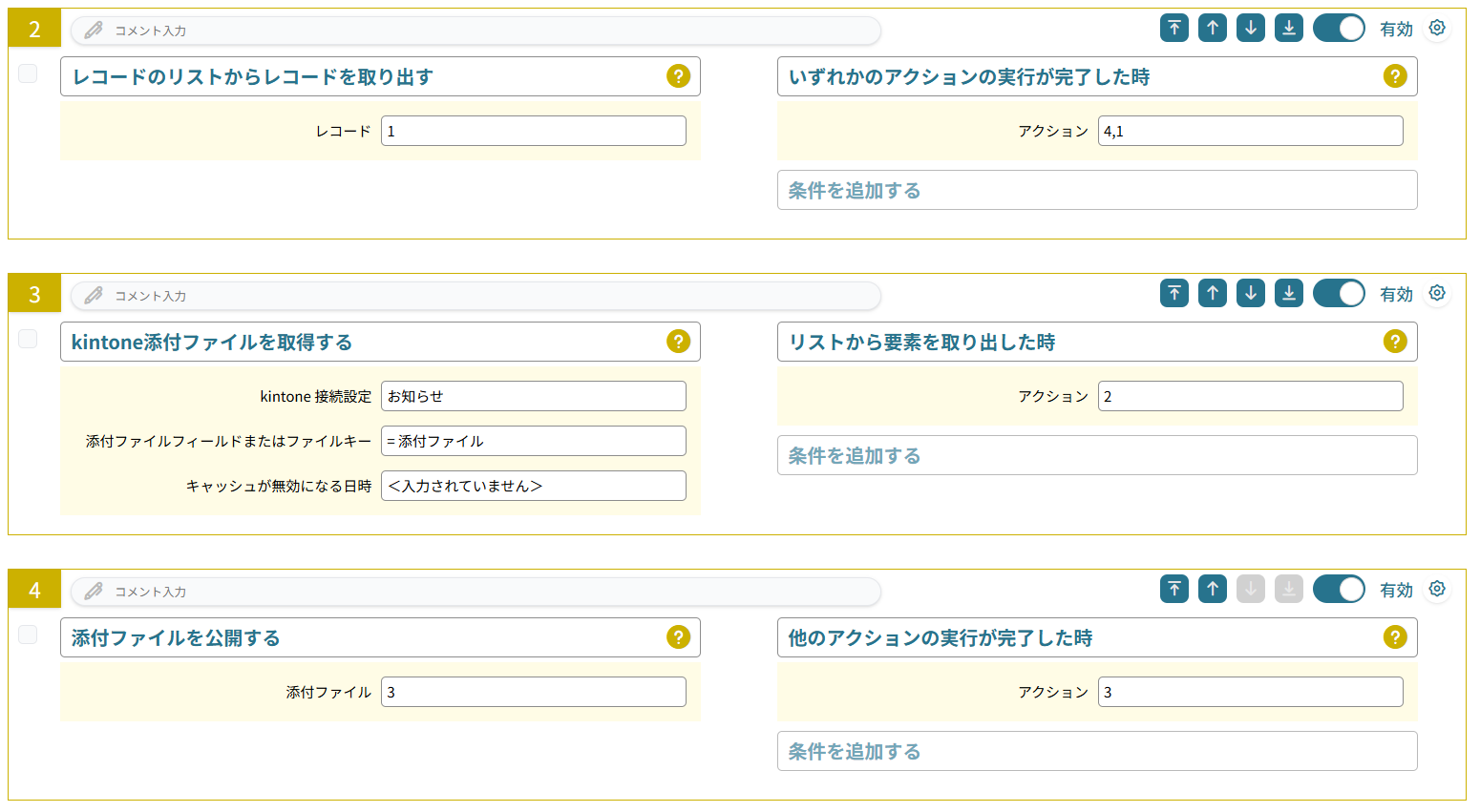アクション4は、レコードごとの添付ファイルを取得して、ダウンロード可能な状態に公開するアクションです。