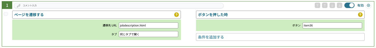 TOPページから下記のボタンを押した時に募集要項ページに遷移したいので、「ページ内処理」で設定します。