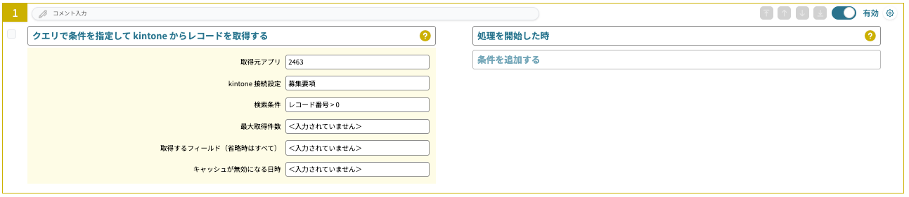 「表示するレコード」では「ページ生成時処理」で設定したアクション1を指定します。(設定内容は後述)