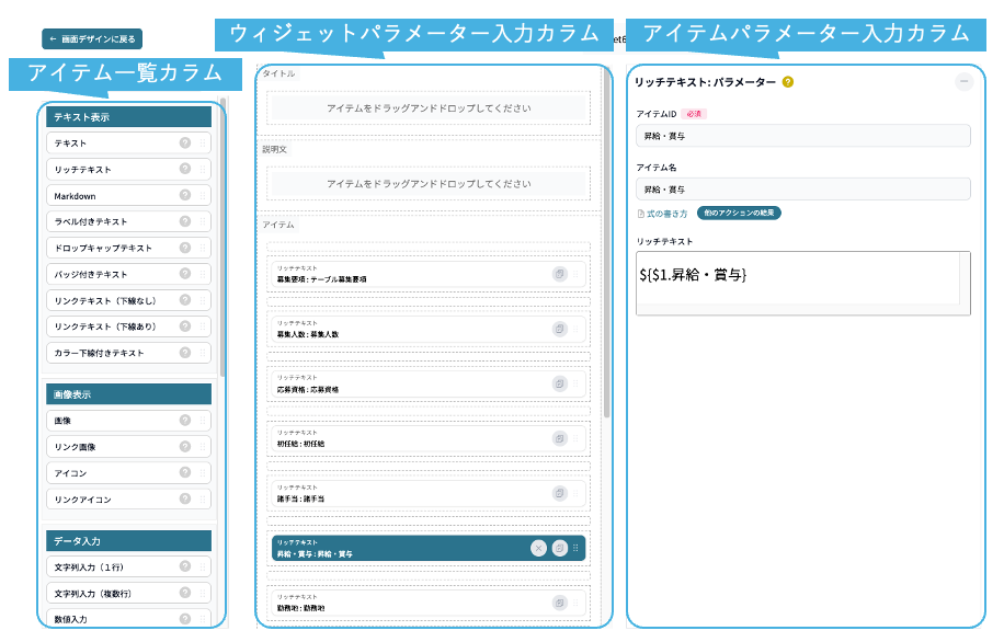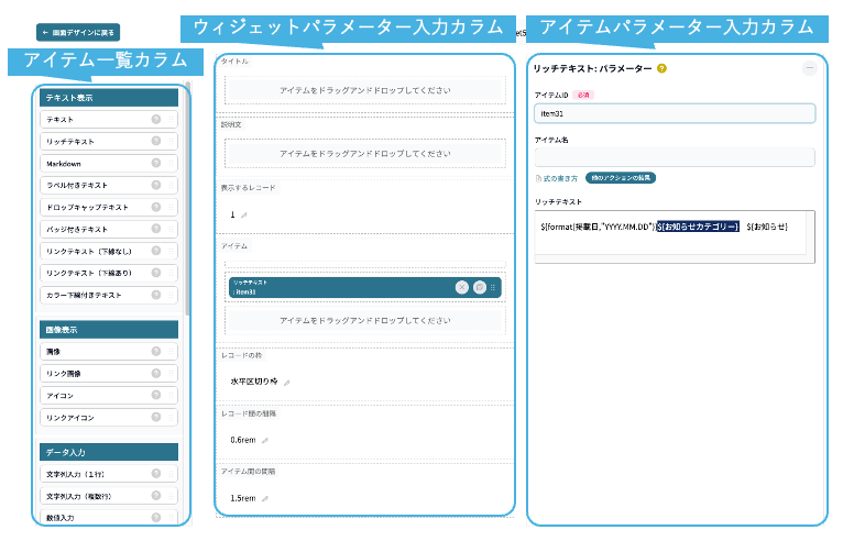 表示したい項目数分アイテムを追加して、「アイテム名」(灰色部分)と「リッチテキスト」の設定のみで表示可能です。
