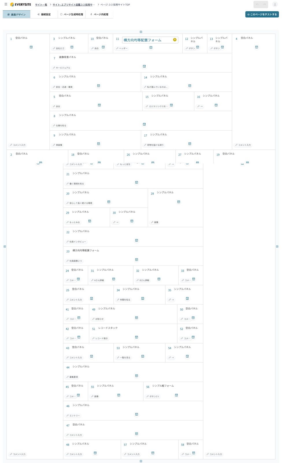 ページの全体像(レイアウト)を決める部分になりますので、いったん、紙の上や他のツール等でページのデザインを検討した上で、エブリサイトの画面デザインの設定に進んでいただくとスムーズです。