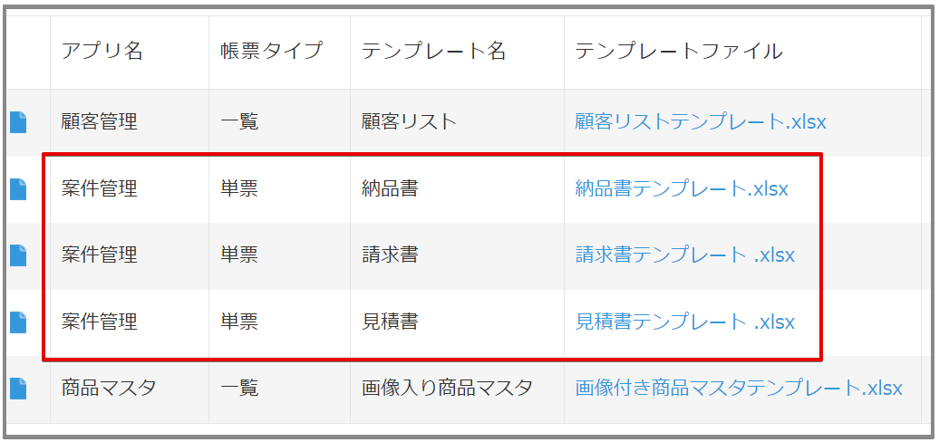 テンプレート管理アプリには予め以下のようにテンプレートファイルを登録しておきます。この例では「案件管理」アプリに「納品書」「請求書」「見積書」の3種類のテンプレートファイルを登録します。