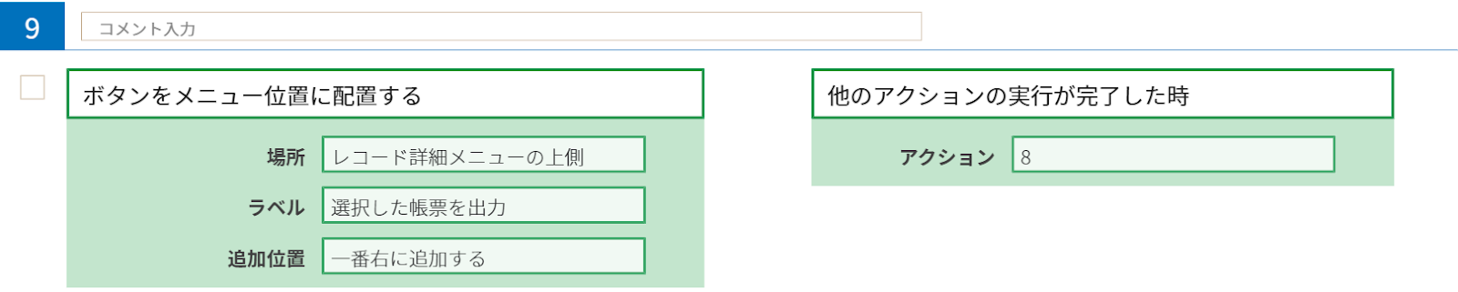 やること「ボタンをメニュー位置に配置する」、条件「他のアクションの実行が完了した時」を用います。