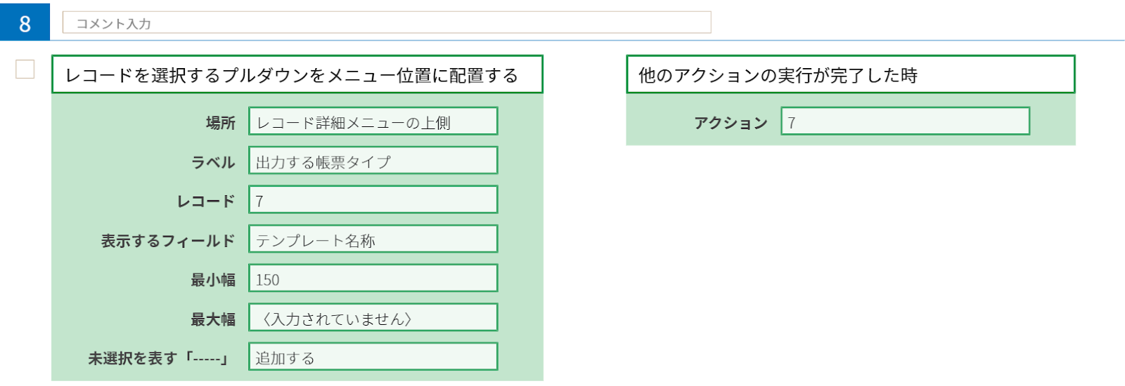 やること「レコードを選択するプルダウンをメニュー位置に配置する」、条件「他のアクションの実行が完了した時」を用います。