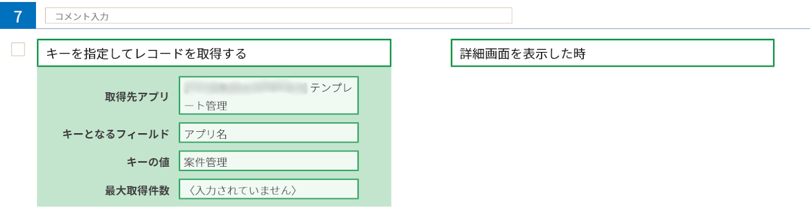 やること「キーを指定してレコードを取得する」、条件「詳細画面を表示した時」を用います。