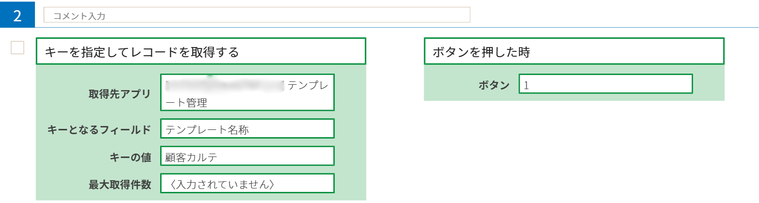 続いて、やること「キーを指定してレコードを取得する」、条件「ボタンを押した時」を用いて、ボタンを押した時に先ほど作成した顧客リストテンプレートを登録したレコードを取得しておきます。