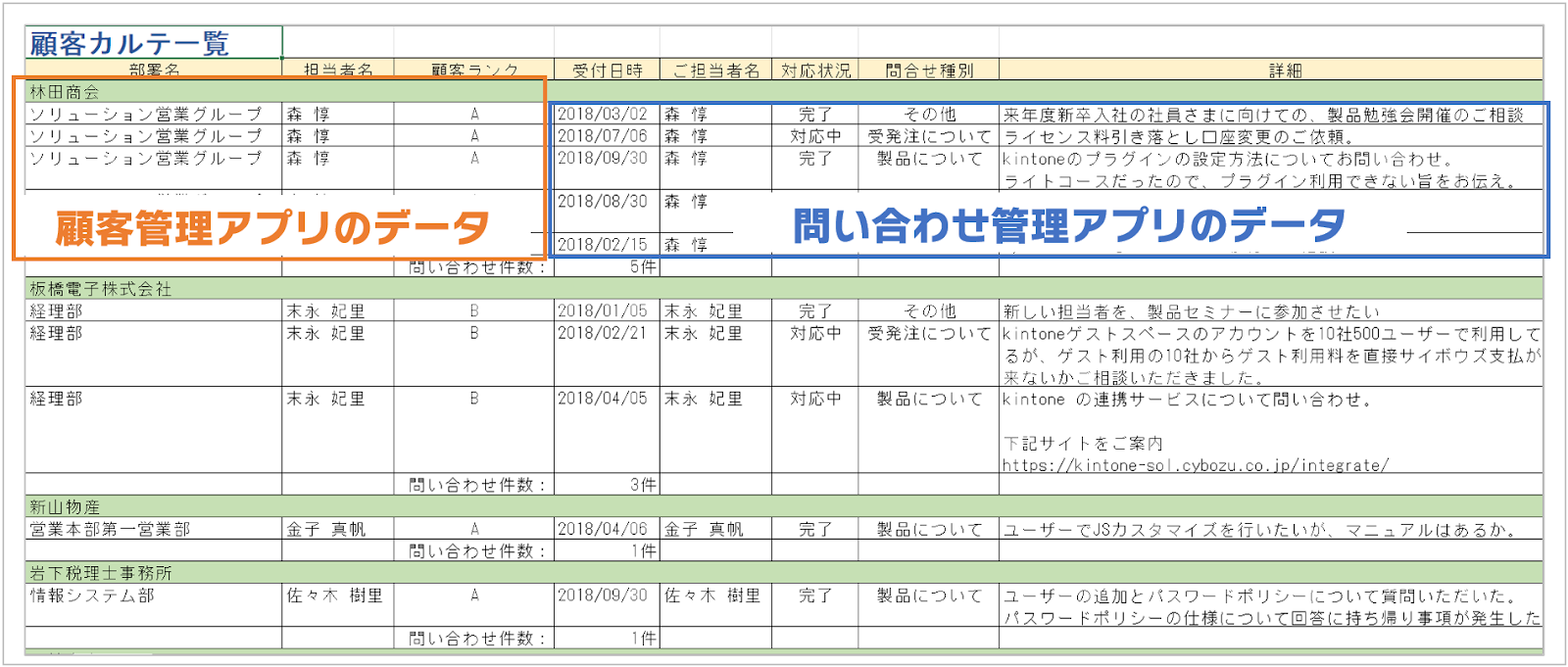 この例では顧客管理アプリに登録されている顧客情報と併せて、関連レコードとして登録されている問い合わせ情報の一覧を以下のように出力します。