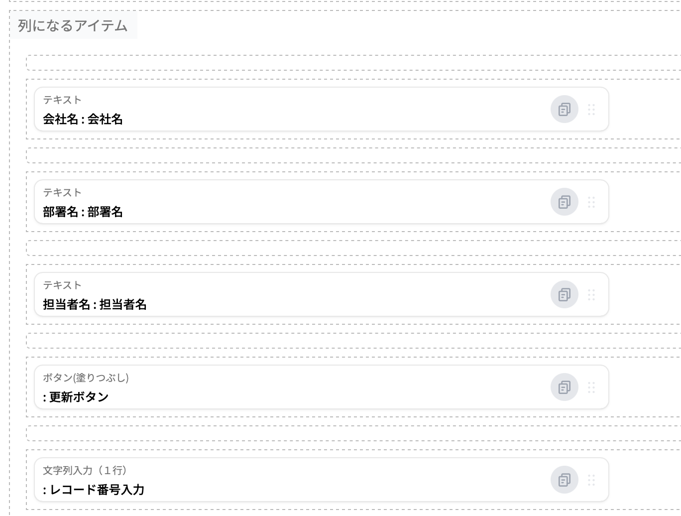 文字列入力(1行)アイテムを利用すると、「ボタンを押した時」に、ボタンを押した行に入力されている値を取得でき、${アイテムID}の形で利用ができます。