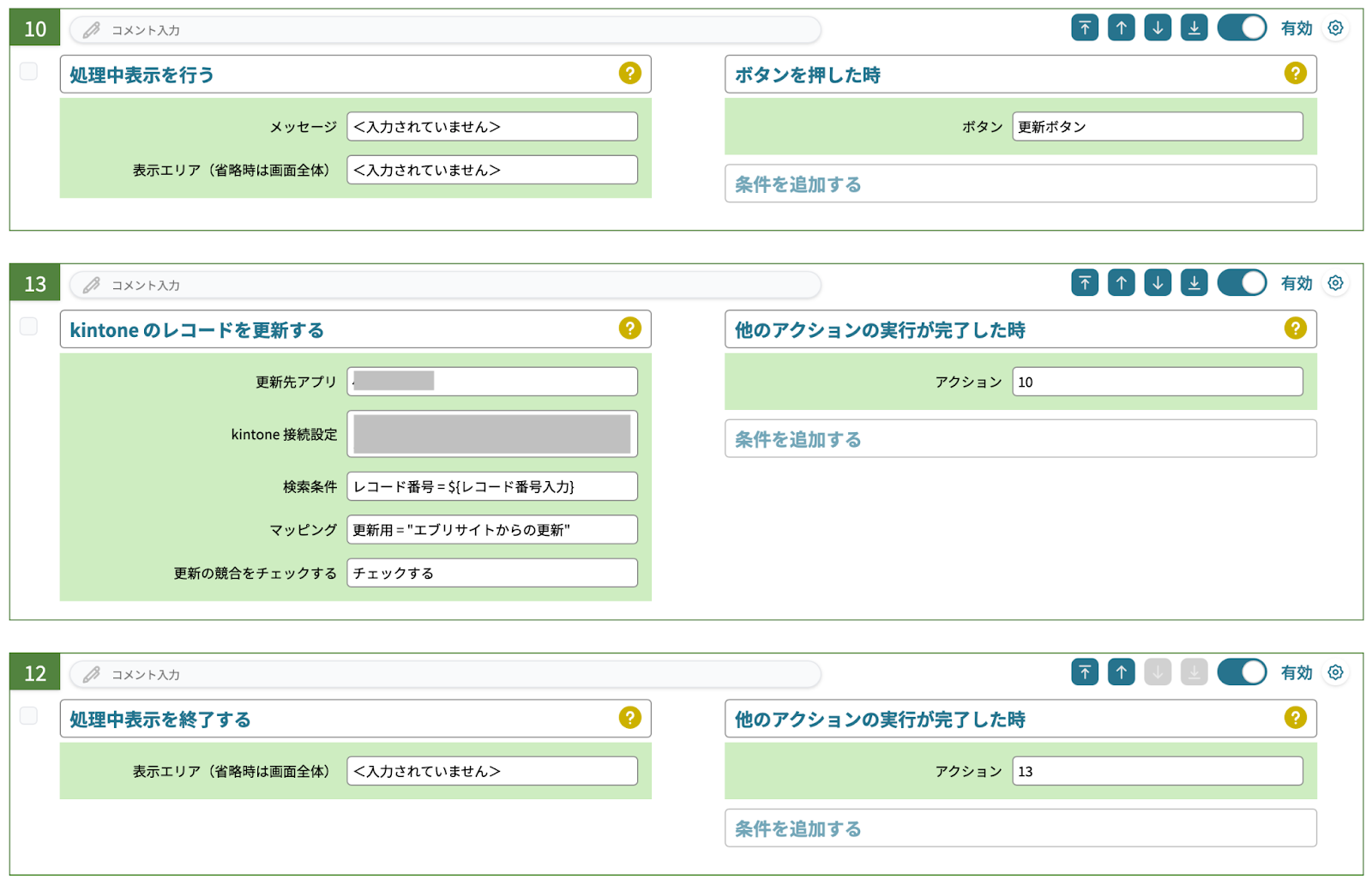 やること「kintone のレコードを更新する」、条件「ボタンを押した時」だけのアクションでも実現可能なのですが、操作するユーザーにわかりやすくするために「処理中表示を行う」「処理中表示を終了する」などを利用しておくと良いでしょう。