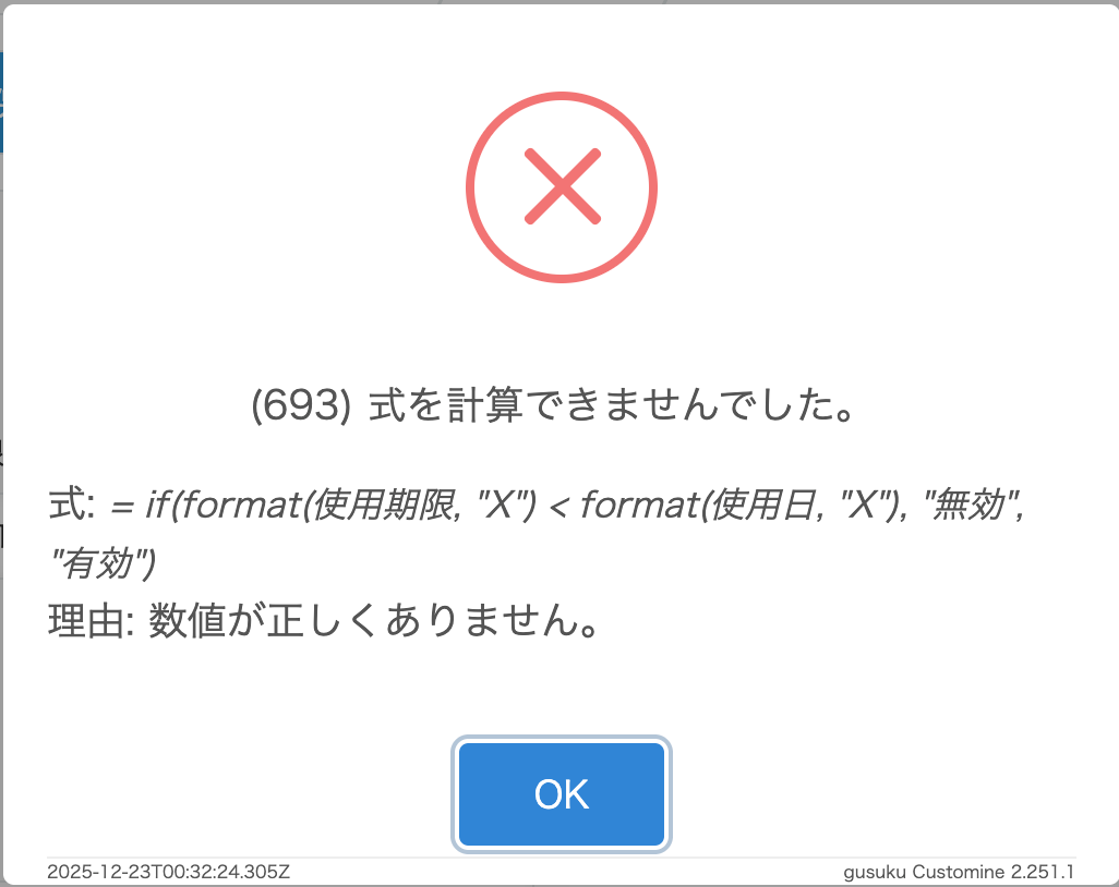 「使用期限」と「使用日」の日付を比較して、「有効・無効」フィールドに値をセットする。