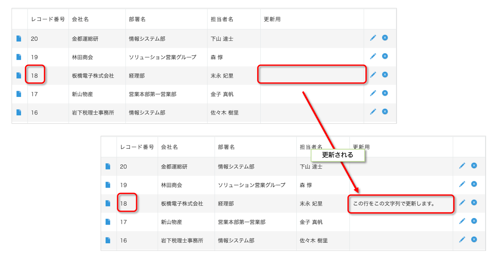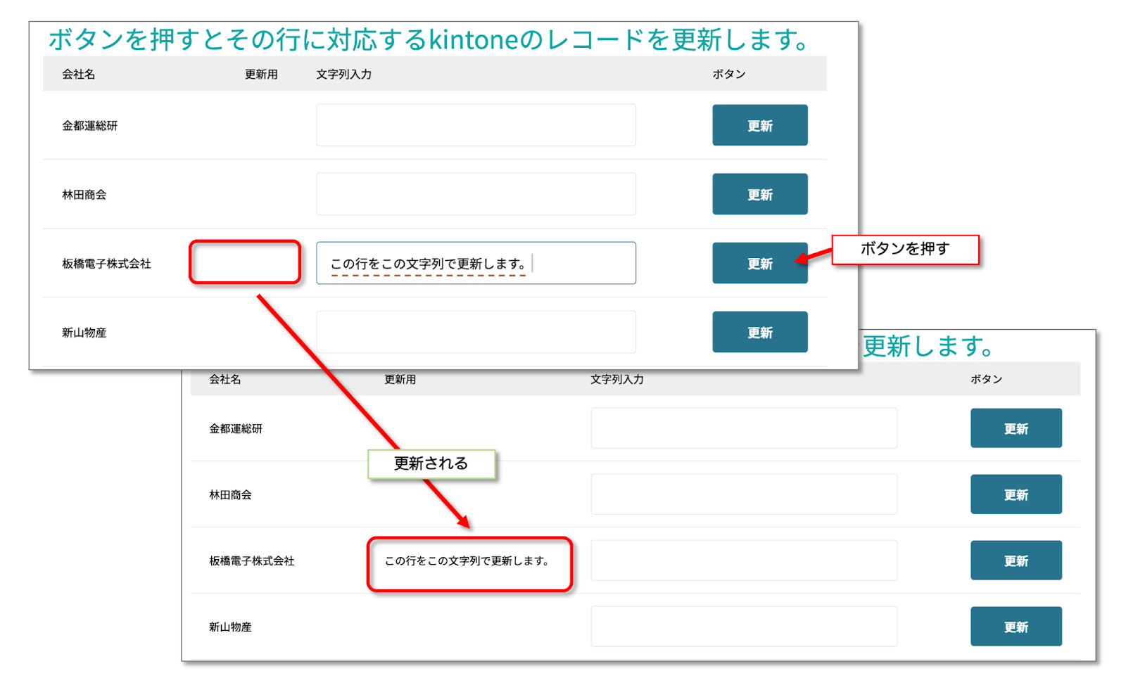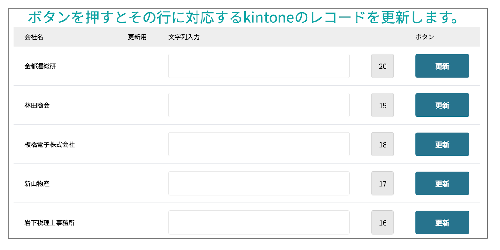 エブリサイトで作成されたページのシンプルテーブル内の「更新」ボタンを押すと、対応するkintoneアプリのレコードが更新されます。