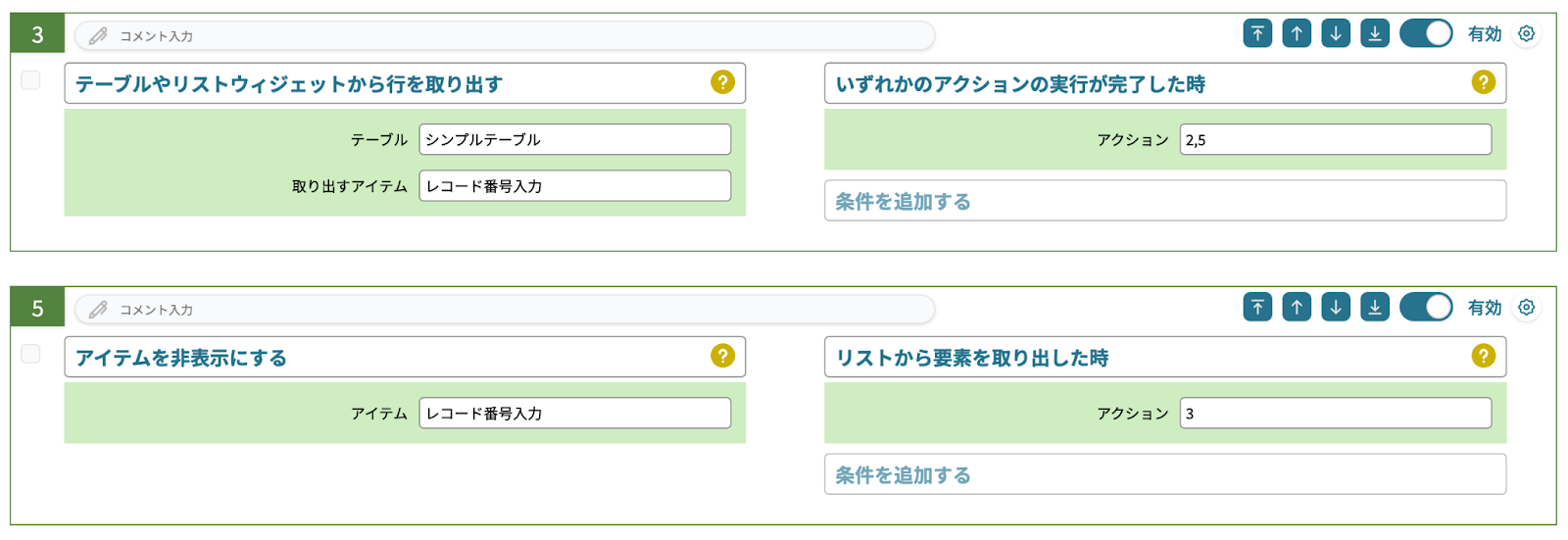 アクション3、5はシンプルテーブル内の入力アイテムについての設定です。