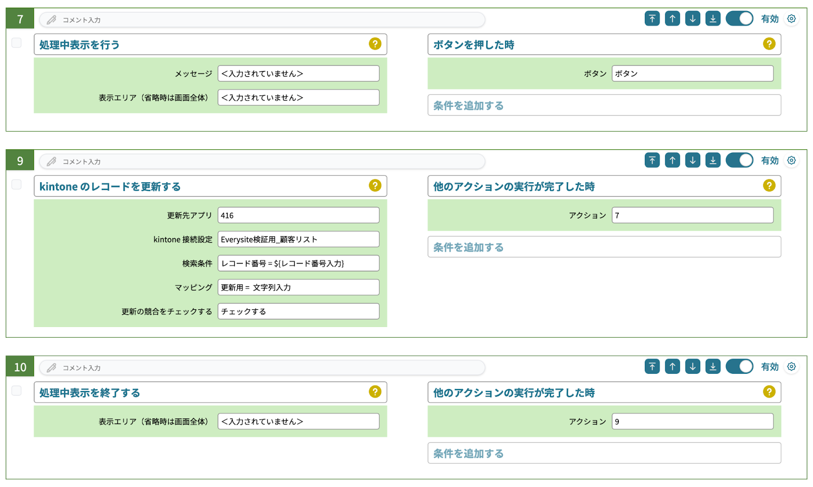 最後に「ページをリロードする」で画面のリロードを行い、kintoneレコードの更新結果を反映した表示にします。