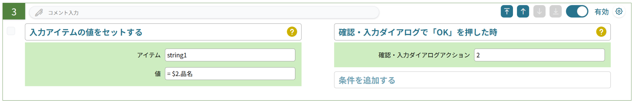やること「入力アイテムの値をセットする」、条件「確認・入力ダイアログで「OK」を押した時」を用い、ポップアップで選択した値を入力アイテムに値としてセットします。