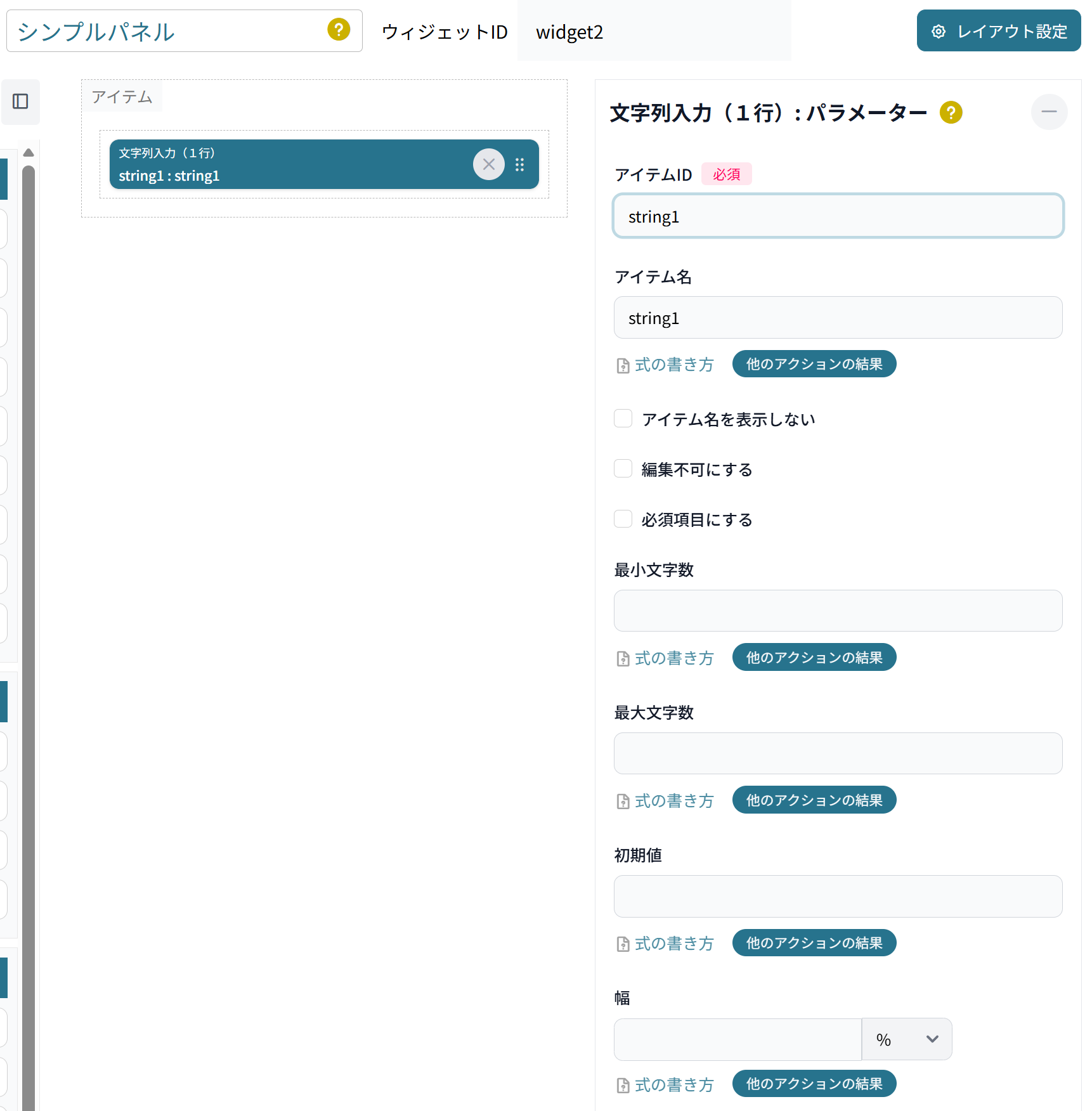 ウィジェットID:widget2(下側の)シンプルパネルには、「string1」という名前でデータ入力の文字列入力(1行)アイテムを設定します。