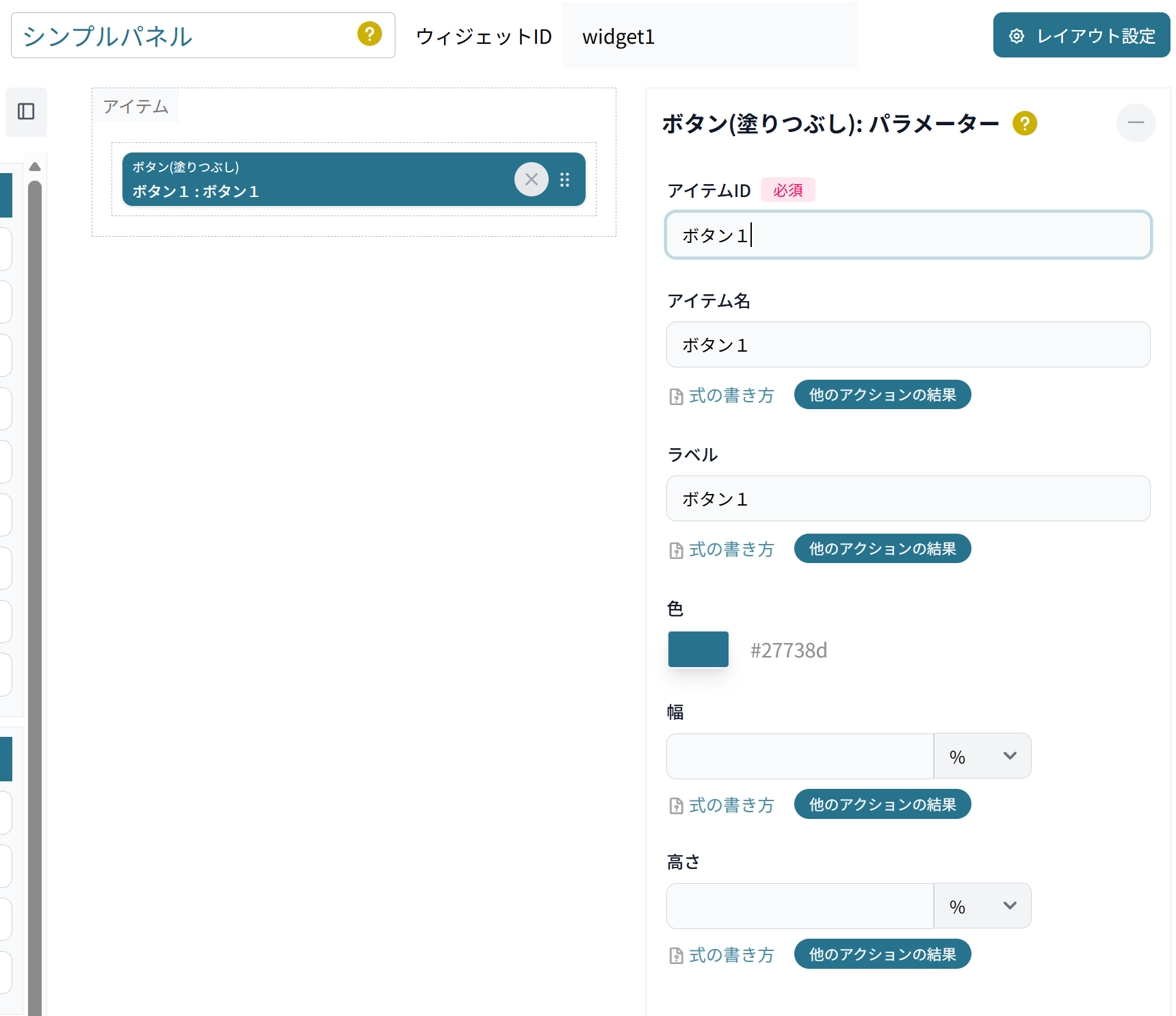 ウィジェットID:widget1(上側の)シンプルパネルには、「ボタン1」という名前でボタンのボタン(塗りつぶし)を設定します。