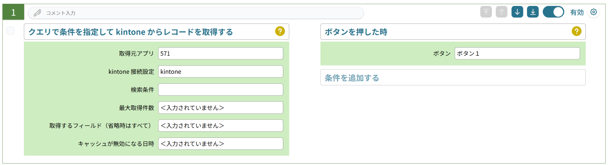 やること「クエリで条件を指定して kintone からレコードを取得する」、条件「ボタンを押した時」を用い、レコードを取得します。