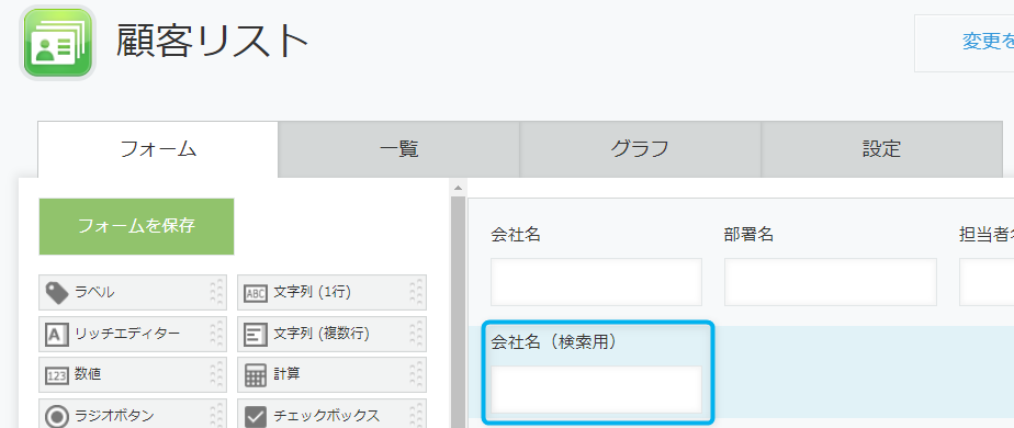 顧客リストアプリにレコードを追加し、会社名を入力した上でレコードを保存すると、会社名を元に検索用文字列が作成され、会社名(検索用)フィールドにセットされます。