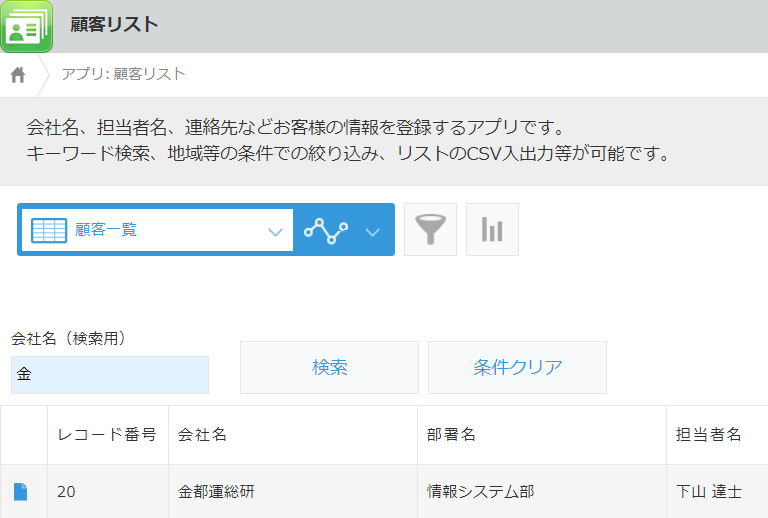 顧客リストアプリの「会社名」フィールドの値を、日本語の一文字や英数字の部分一致で検索できる検索フォームを設置する。