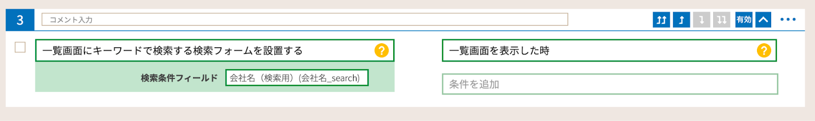 また、条件は一覧画面で検索フォームを表示したいので「一覧画面を表示した時」を指定します。