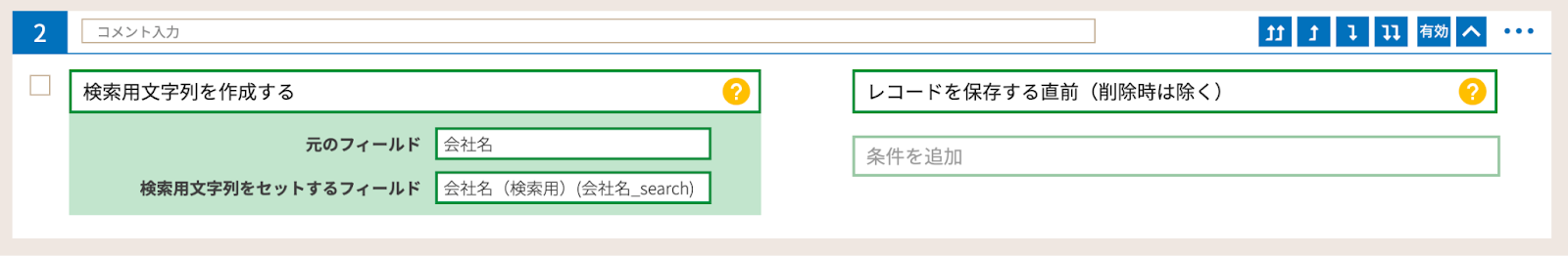 レコード保存直前に、会社名(検索用)フィールドに検索用文字列をセットするため「検索用文字列を作成する」を使用します。
