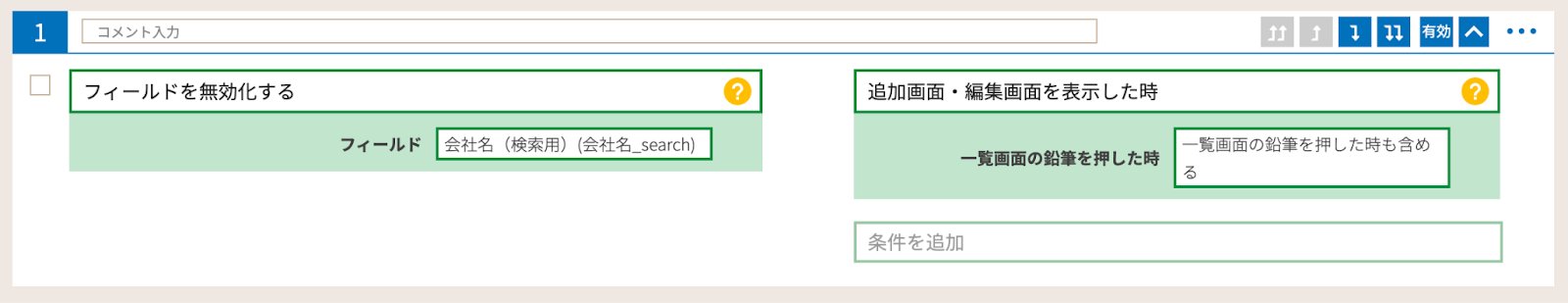 また、条件はフィールドの編集が可能な画面で変更を不可としたいので「追加画面・編集画面を表示した時」を選択します。
