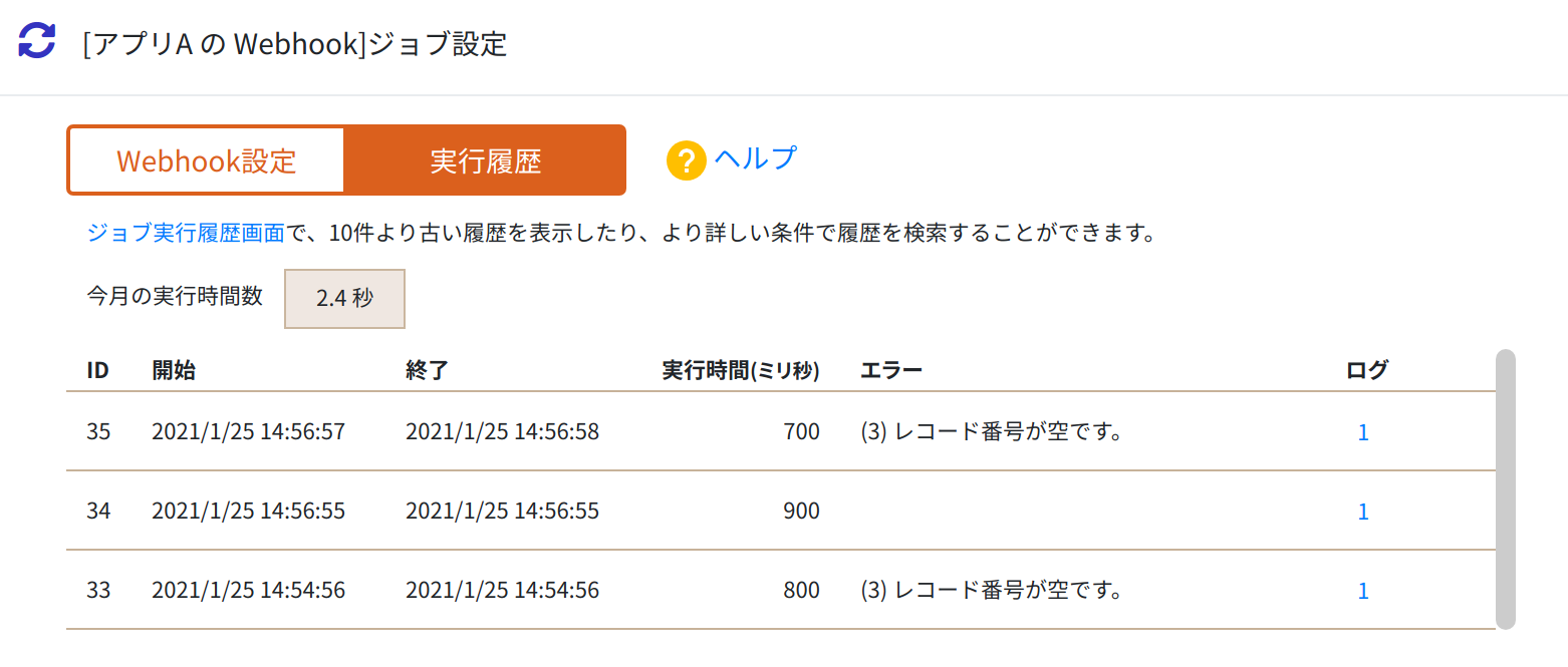 「実行履歴」をクリックすると、最新10件までの実行履歴が確認可能です。