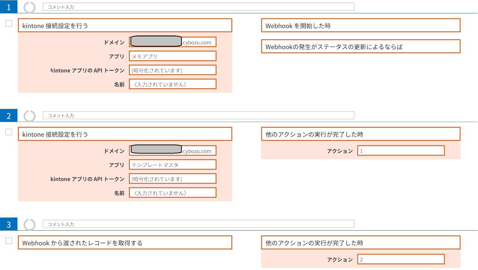 その後「Webhook から渡されたレコードを取得する」でメモアプリのレコードを取得して「ステータスが特定の値ならば」でステータスが特定の値のときだけ出力処理に移ります。