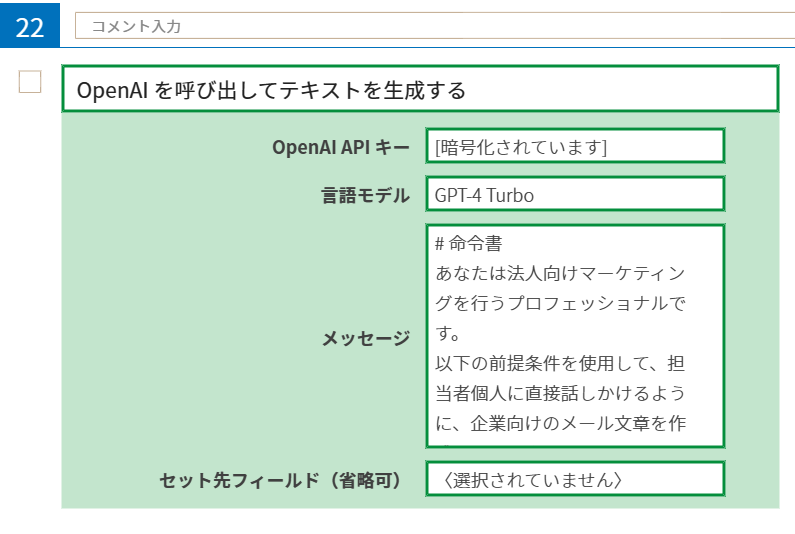 値:やること「OpenAI を呼び出してテキストを生成する」の結果をフィールドに反映するので、「= $6」を設定します。