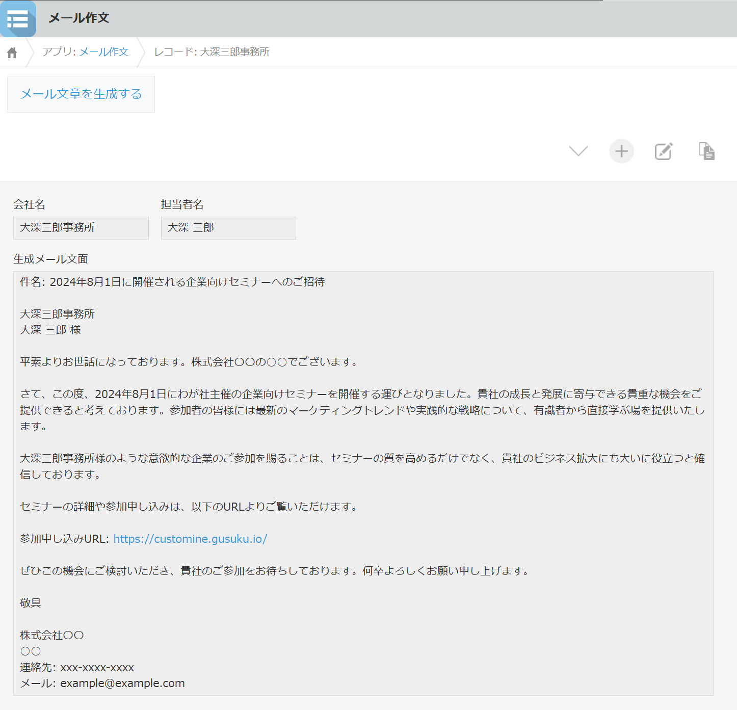 今回はやること「OpenAI を呼び出してテキストを生成する」を使い、OpenAIにメールの例文を考えてもらうカスタマイズを実現しました。