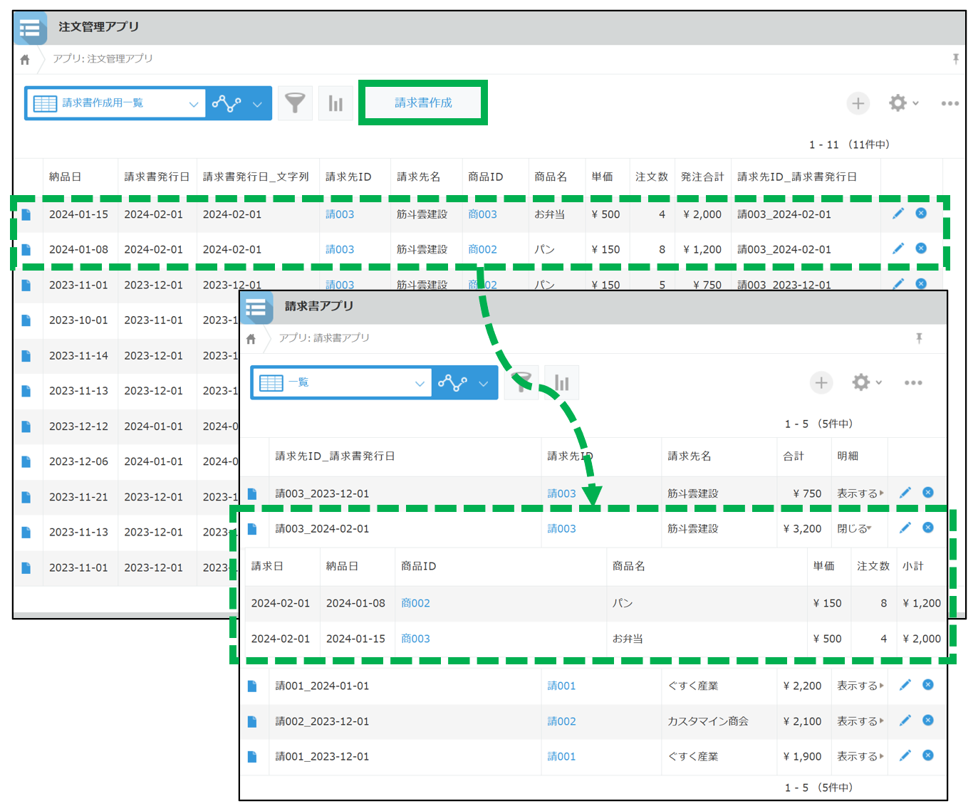 ボタンを押した当月以降の請求書発行日となっているレコードをもとに、請求先・請求年月単位で集約し、請求書アプリにレコードを作成する