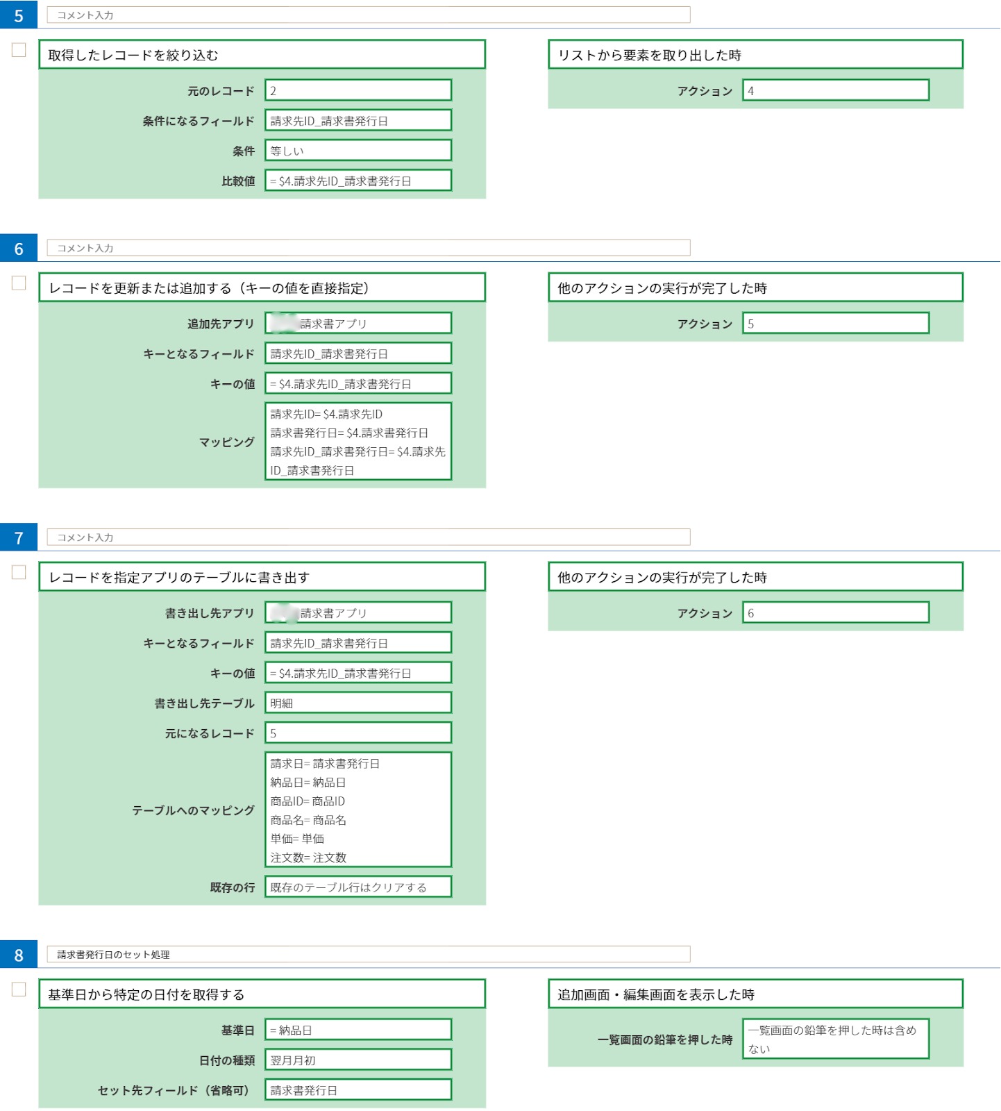※やること「リストから要素を取り出す」の次のアクションは必ず、1つのアクションでつながるようにし、かつ条件「リストから要素を取り出した時」を使います。また、この時のレコードは「処理月に請求書発行日が設定されたレコードを取得する」で取得したレコード(今回の場合はアクション2)を対象とし、「請求先ID_請求書発行日」が一致するものを絞り込んでください。