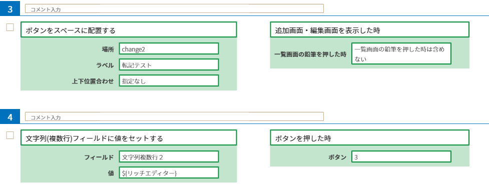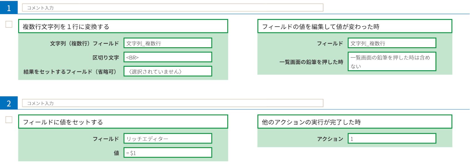 やること「複数行文字列を1行に変換する」を使い、区切り文字に「<BR>」を設定することで、複数行文字列の改行をリッチテキストの形式に変換する事ができ、これを用いるとリッチエディターフィールドへのコピーも実現できます。