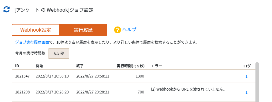 もしこの Webhook ログ の画面に記録がない場合は、kintone の Webhook の設定が誤っているか、または kintone の仕様により Webhook の通知が発生しない操作を行ったため、発生しなかった可能性があります。