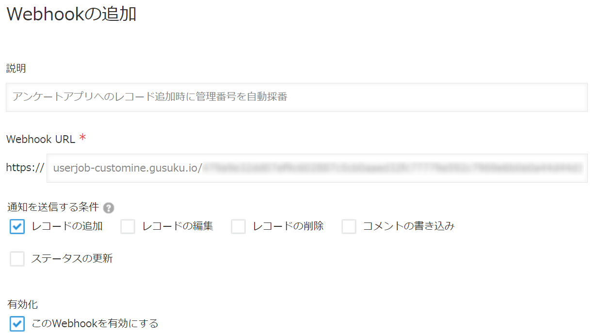 kintone の アプリの設定 >Webhook>Webhook の追加 から、kintone アプリに Webhook の設定を追加します。このとき、Webhook URL に先ほどコピーした URL を貼り付けます。Webhook の設定は、Webhook URL に指定した宛先に、kintone から Webhook の通知を送るための設定です。