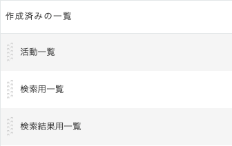 一覧画面は次の3つの画面「活動一覧」「検索用一覧」「検索結果要一覧」を作成してください(絞り込みなどの条件は全て不要となります)。