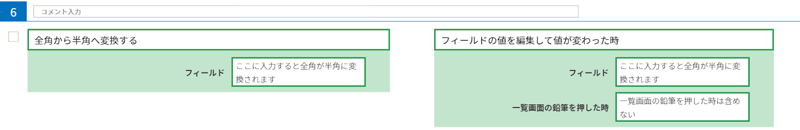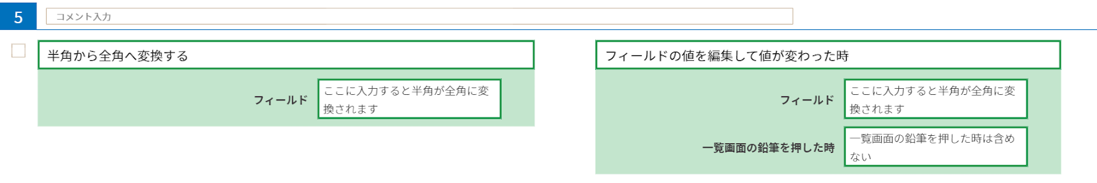 アクション5ではやること「半角から全角へ変換する」を条件「フィールドの値を編集して値が変わった時」で設定し、値を入力後に全角に変換しています。