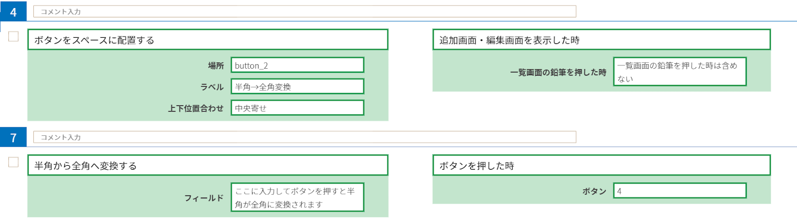 アクション7では、ボタンを押した時にやること「半角から全角へ変換する」でフィールドの値を全角に変換しています