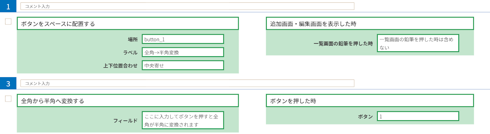 アクション3では、ボタンを押した時にやること「全角から半角へ変換する」でフィールドの値を半角に変換しています