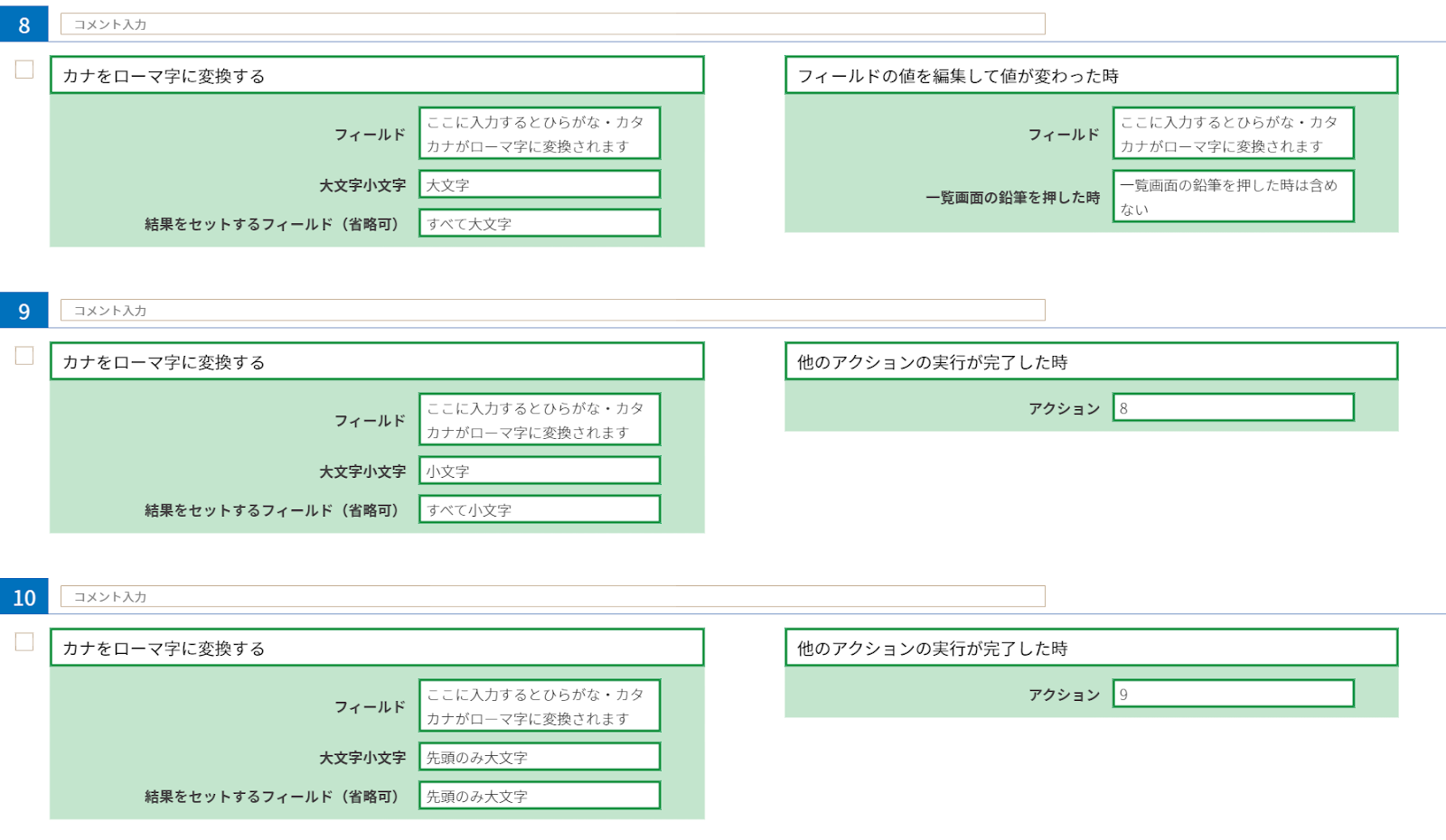 アクション8では、やること「カナをローマ字に変換する」を条件「フィールドの値を編集して値が変わった時」で設定し、フィールドの値を編集した時にローマ字に変換してセットしています。
