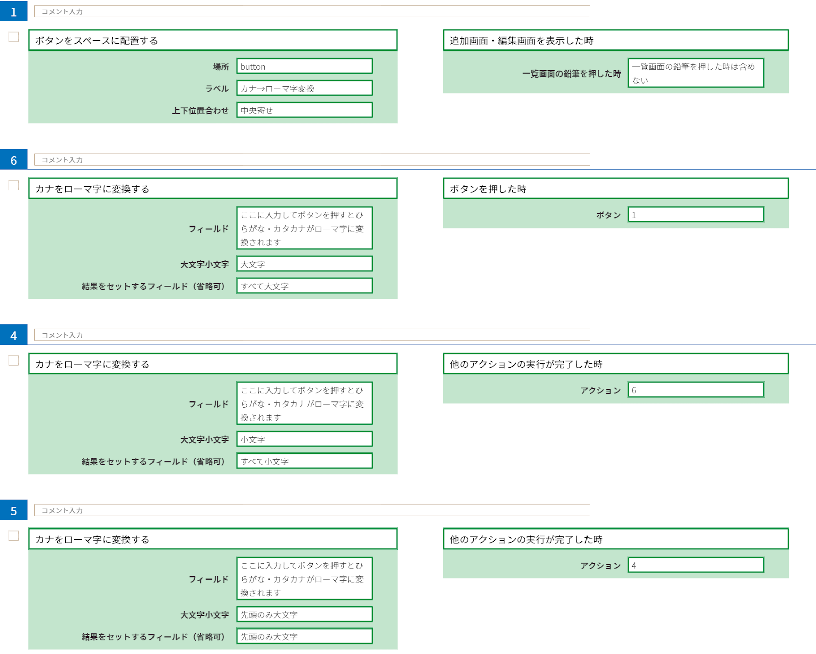 アクション6,4,5では、ボタンを押した時にやること「カナをローマ字に変換する」でフィールドの値をローマ字に変換してセットしています。