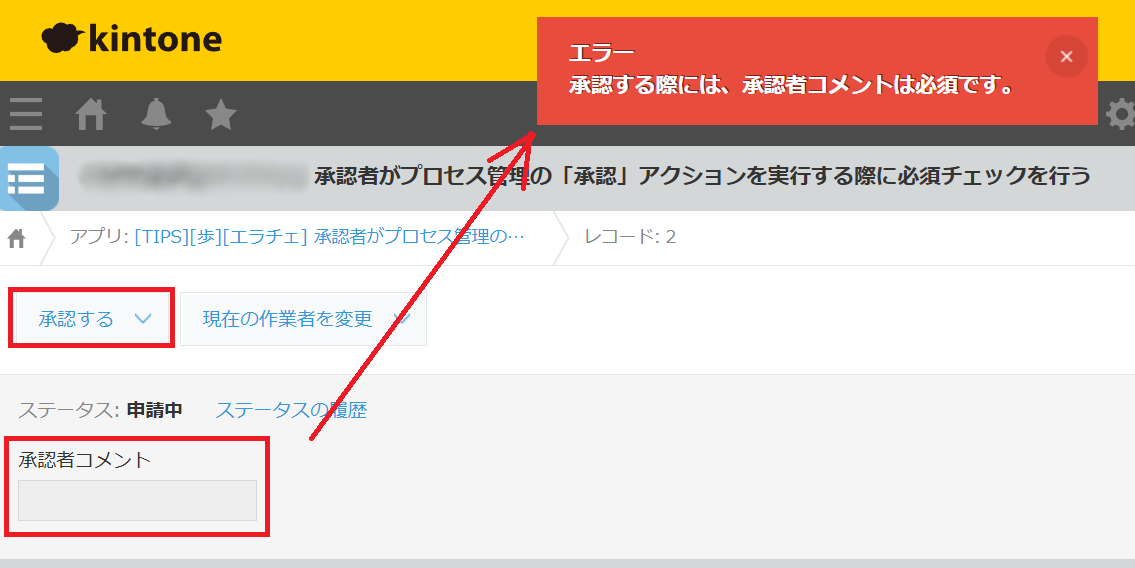 プロセス管理の特定のアクション「承認する」を実行する時にのみ、「承認者コメント」に値が入力されていなければ、エラーを表示してプロセス管理の「承認する」アクションで次に進めないようにします。
