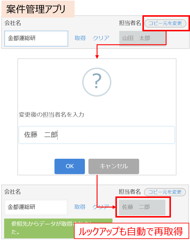 しかしこのカスタマイズにより、案件管理アプリの入力画面を開いたまま、顧客リストアプリを開かずにコピー元データを直接変更できるようになります。
