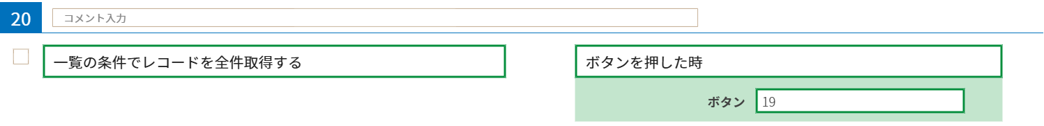 やること「一覧の条件でレコードを全件取得する」、条件「ボタンを押した時」を使い、アクション「19」で設置したボタンを押した時にレコードを取得しています。